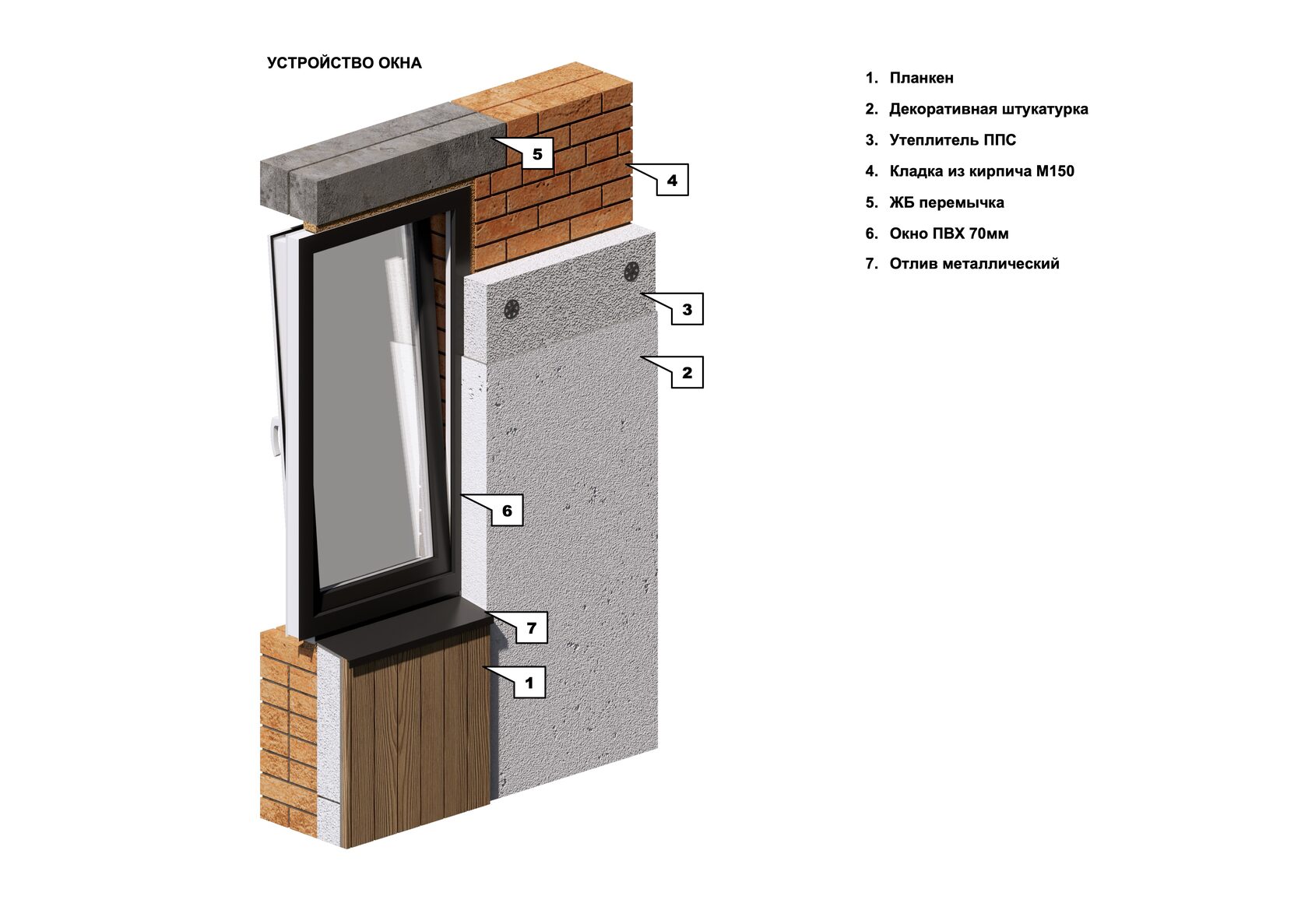 Фасад Утепление 100 мм (ППС 16 Ф РА) Клее-армирующий слой Ceresit Грунт под декоративную штукатурку Ceresit Декоративная камешковая штукатурка Ceresit Краска фасадная Ceresit Планкен из лиственницы, покрашенный матовым бесцветным защитным антисептиком Отливы из металла, RAL 7024 Откосы - мокрый фасад
