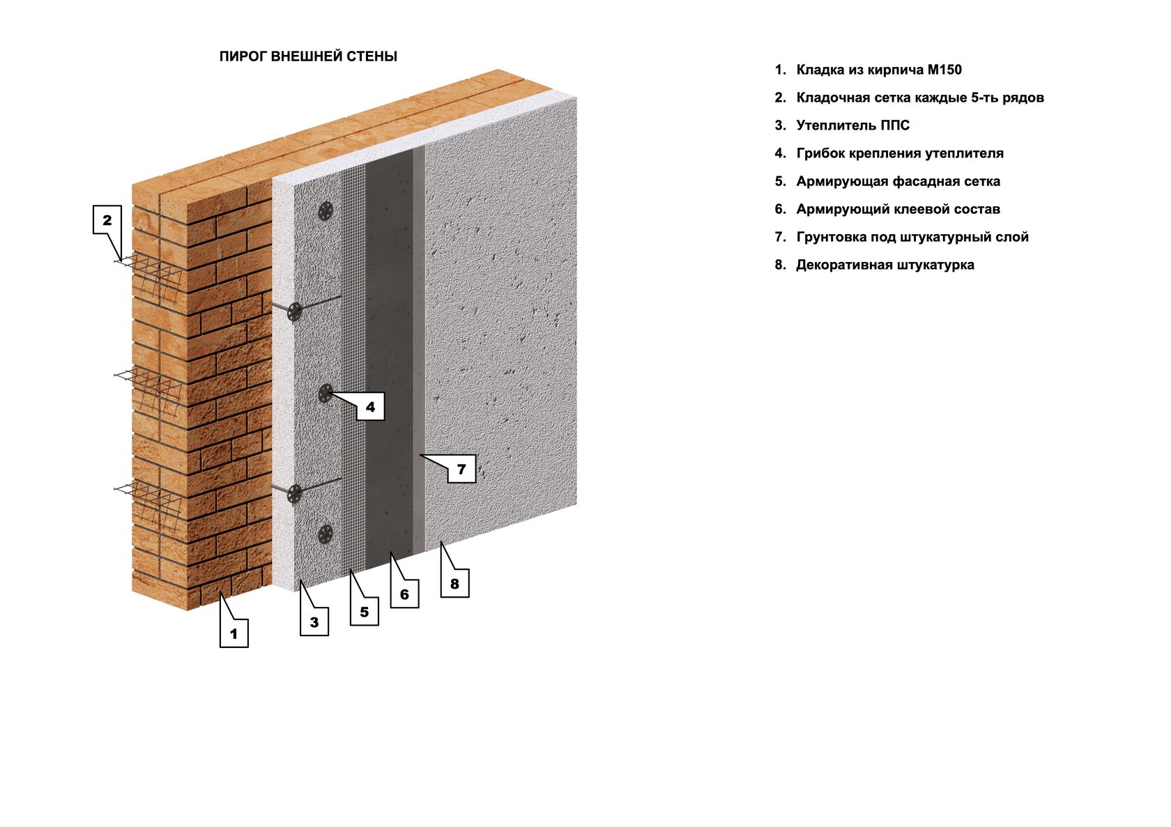 Наружные стены Гидроизоляция Стены из строительного кирпича М150, толщиной 250 мм ЖБ перемычки