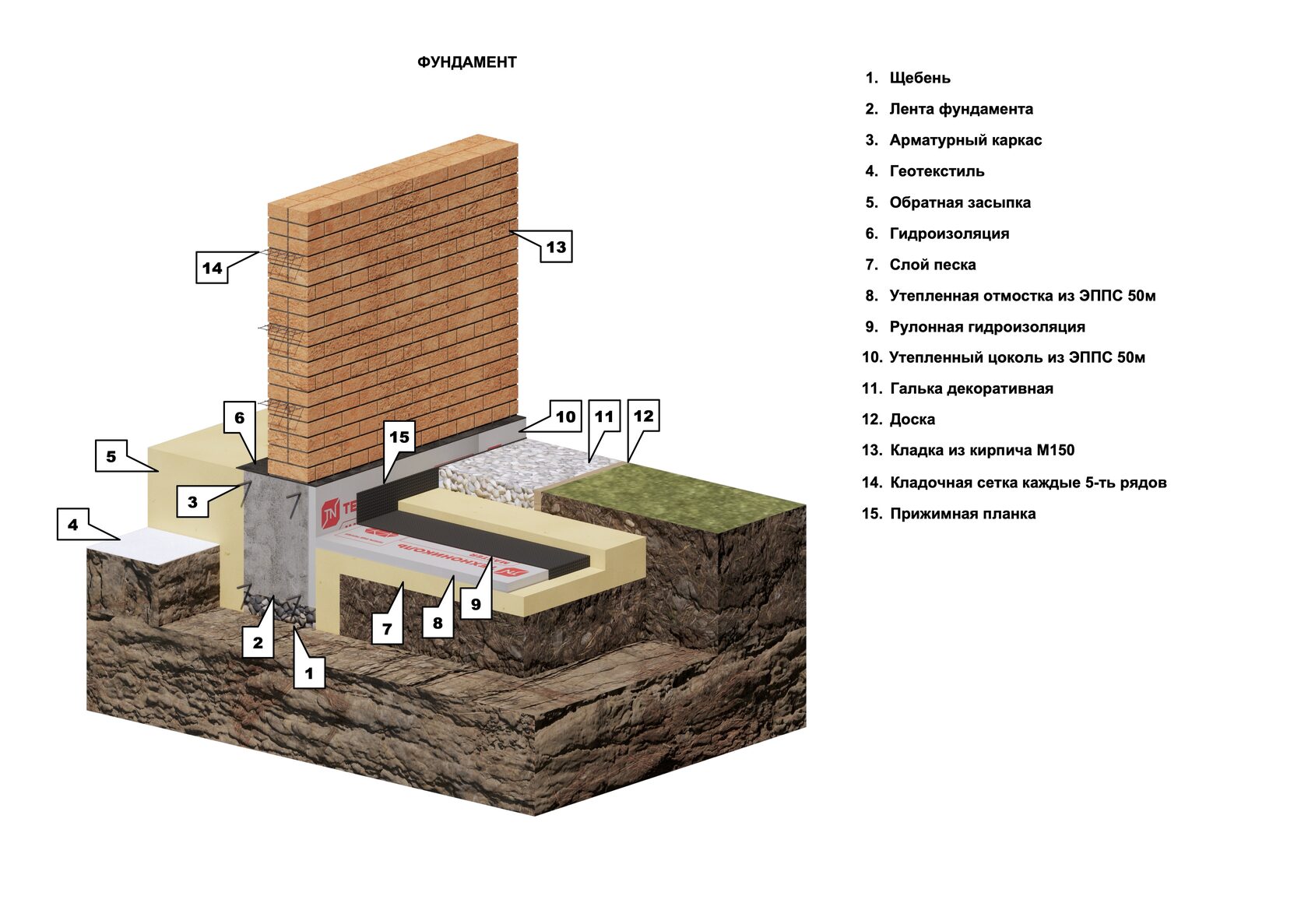 Фундамент Геотекстиль Подушка из песка и щебня Железобетонный ленточный фундамент 600х400 мм Обратная засыпка песком с послойным трамбованием Ввод закладных под коммуникации (водопровод/электричество)