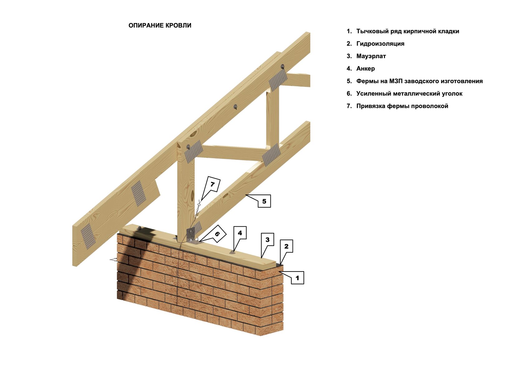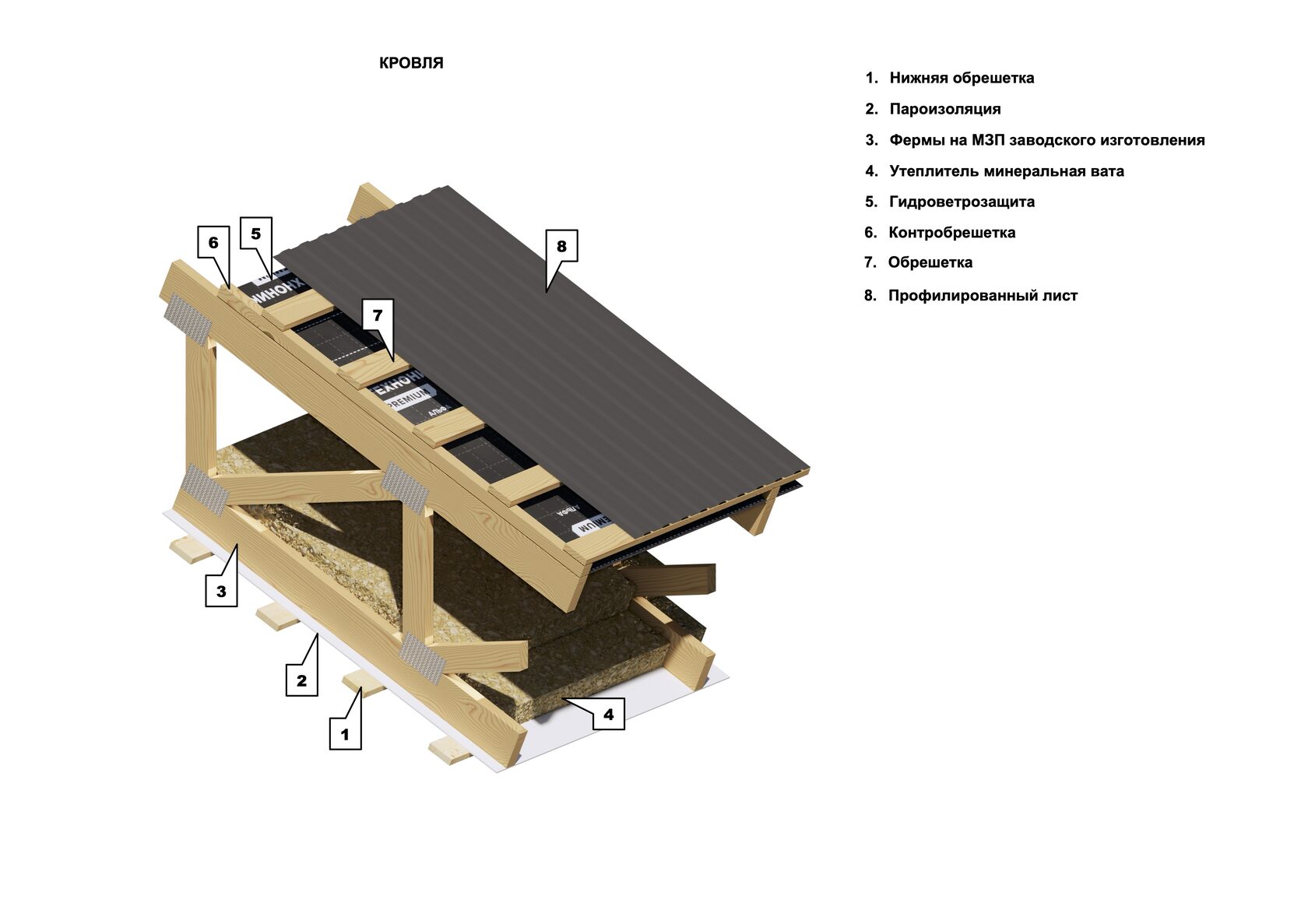 Кровля Мауэрлат (доска 200х50) Стропильные фермы по технологии Mitek Пароизоляционная пленка Диффузионная мембрана (ветро-влаго защита) Утепление 200 мм (минеральная вата) Обрешетка Контробрешетка Профлист 0,45 мм с доборами Вентиляционный грибок